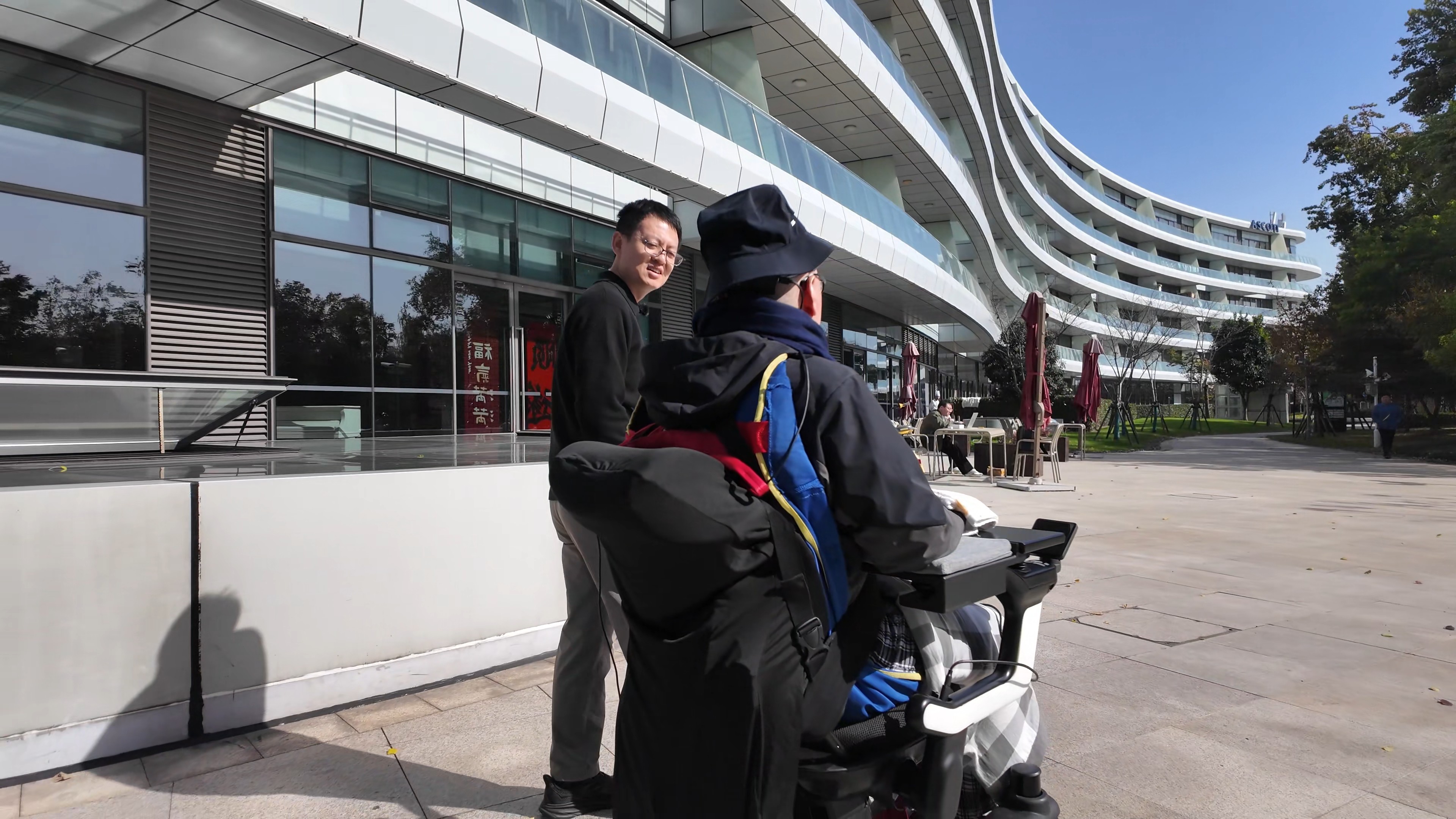 高位截瘫患者(左)通过脑智卓越中心等单位研发的脑机接口系统意念控制轮椅