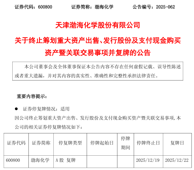 渤海化学(600800)(600800)公告称,公司因筹划出售天津渤海石化有限公司(简称“渤海石化”)100%股权、通过发行股份及支付现金的方式购买安徽泰达新材料股份有限公司(简称“泰达新材”)的控制权事项,公司股票于2025年12月8日(星期一)开市起停牌。经审慎研究,公司决定终止本次交易事项,公司股票自2025年12月22日(星期一)开市起复牌。